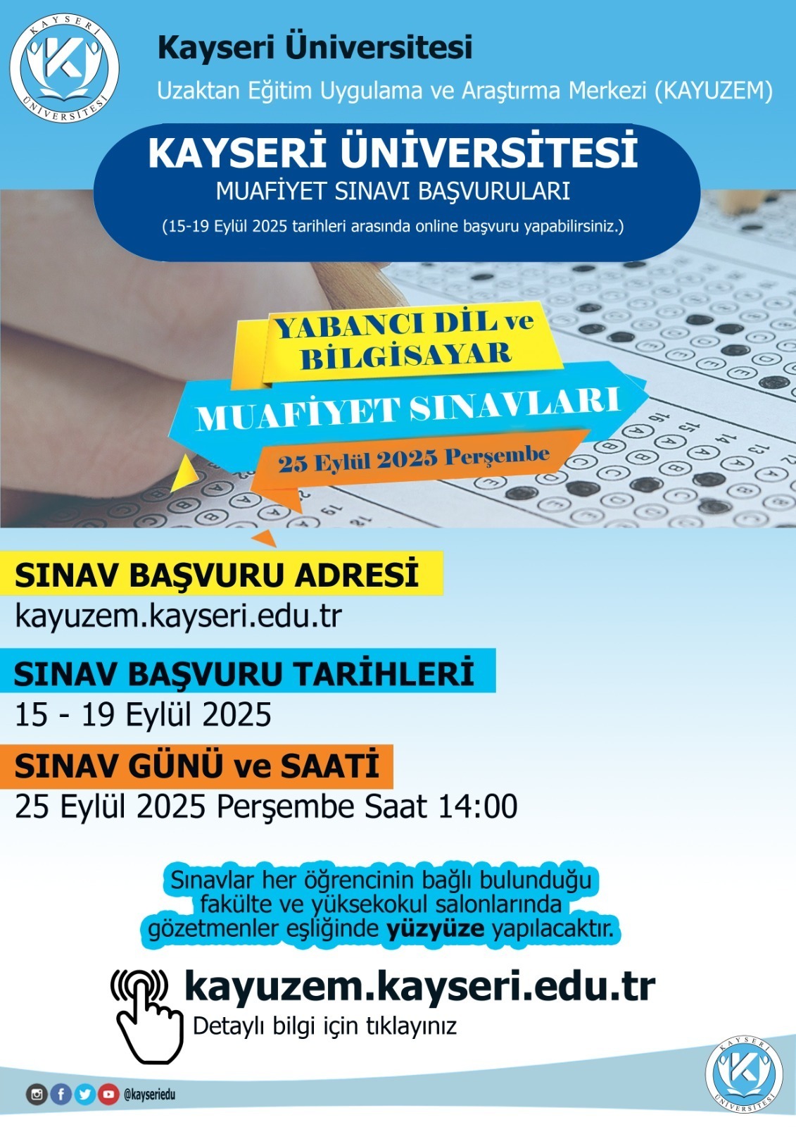Yabancı Dil-I ve Yabancı Dil-II dersleri muafiyet sınavı başvuruları 15-19 Eylül 2025 tarihleri arasında kayuzem.kayseri.edu.tr adresi üzerinden gerçekleştirilecektir. Sınav tarihi 25 Eylül 2025 Perşembe günü saat 14:00'dır. Sınavlar yüz yüze gerçekleştirilecektir. Bilgisayar ve Bilişim Bilimler Fakültesi öğrencileri için Bilgisayar dersi muafiyet sınavı uygulanmamaktadır.