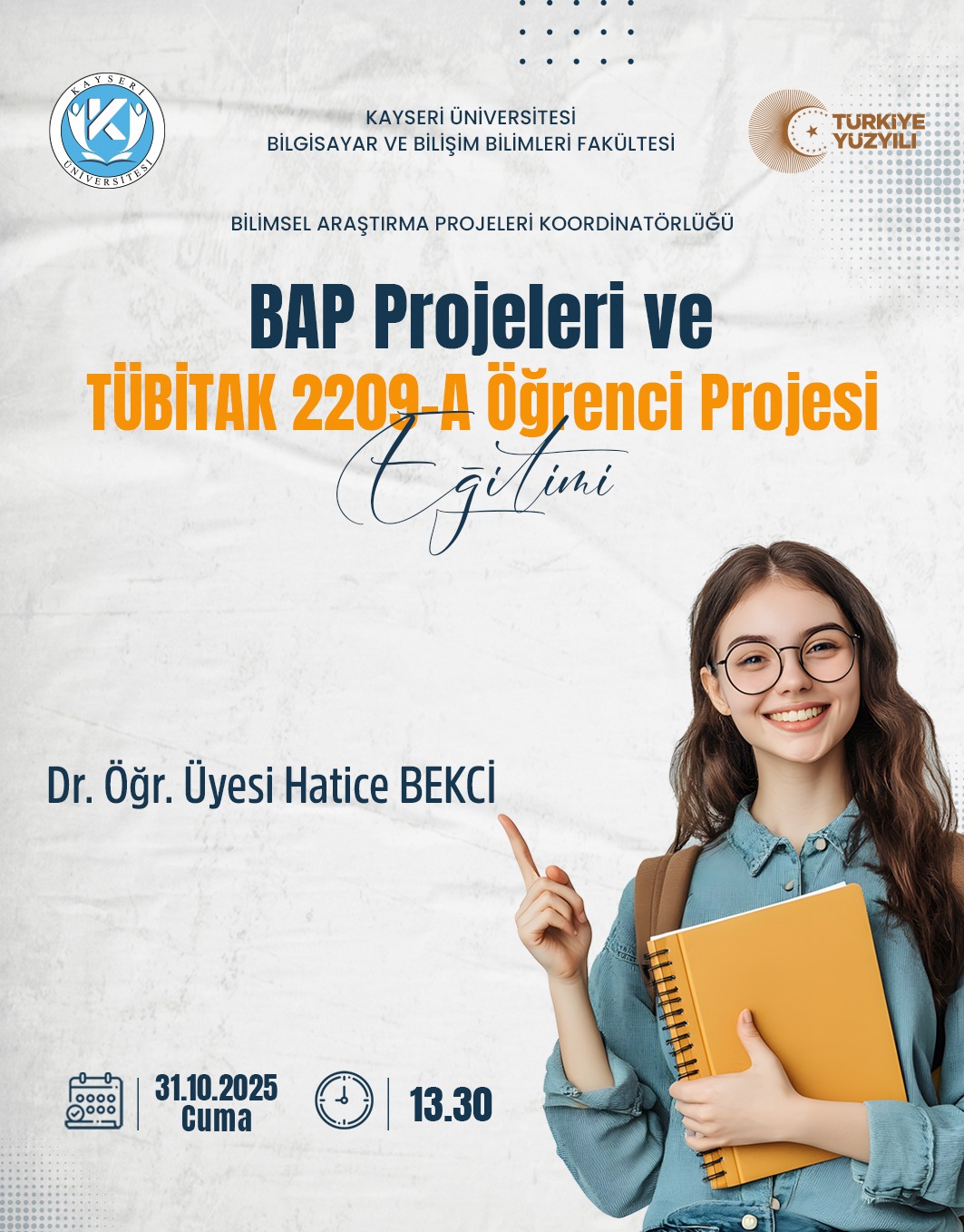 Fakültemiz öğrencilerine yönelik 31.10.2025 Cuma günü saat 13.30'da Uygulamalı Bilimler Fakültesi Toplantı Salonunda Dr. Öğr. Üyesi Hatice BEKCİ tarafından "BAP Projeleri ve TÜBİTAK 2209 Öğrenci Projesi Eğitimi" verildi.